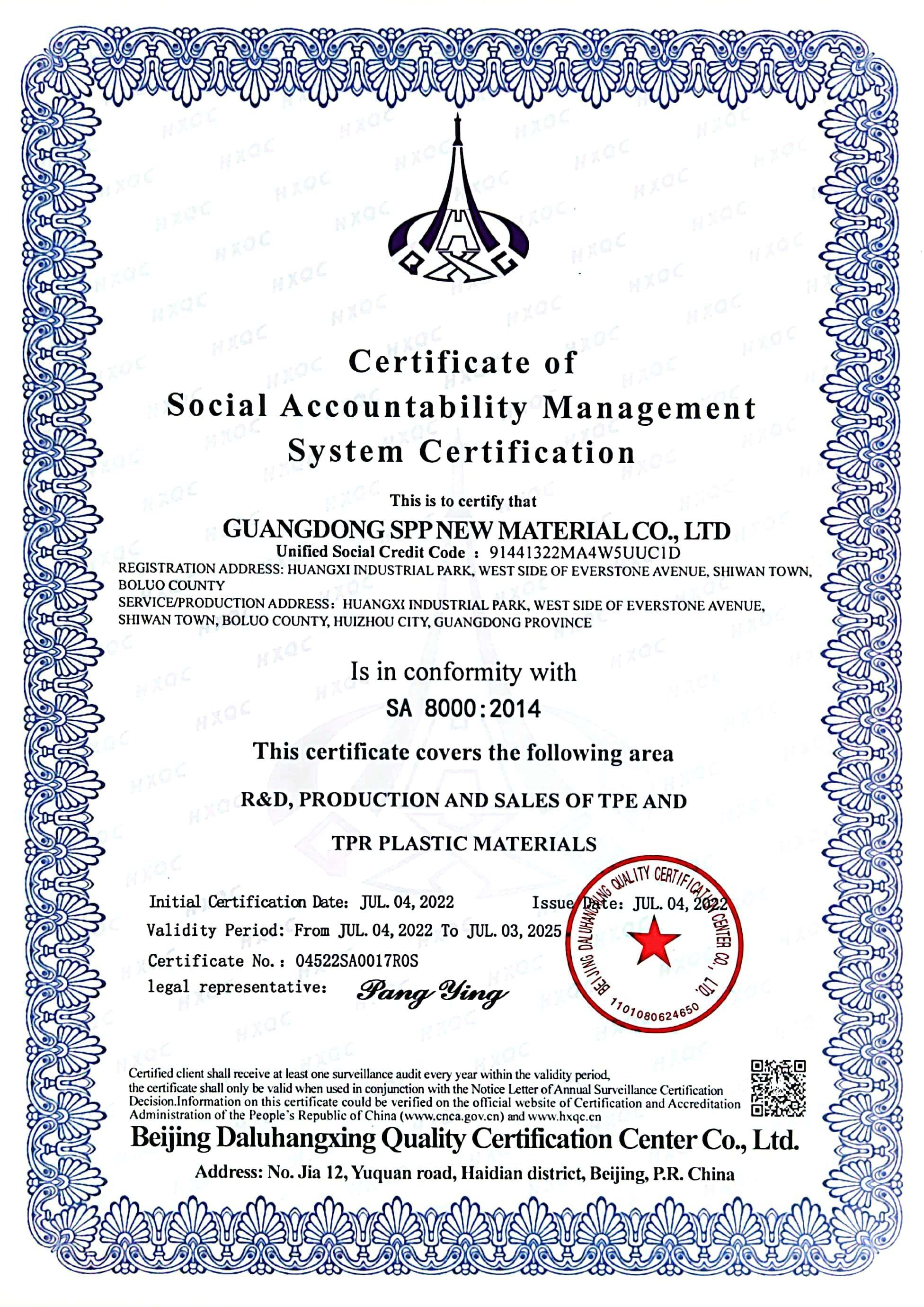 塑伯公司榮獲SA8000:2014社會責(zé)任體系認證